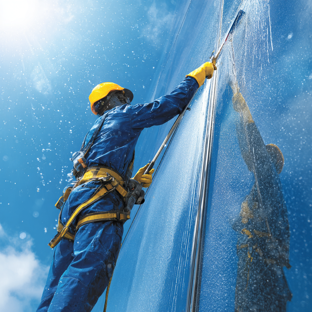 Профессиональная чистка стеклянных фасадов и окон на высотных зданиях для кристальной прозрачности и безупречного внешнего вида.