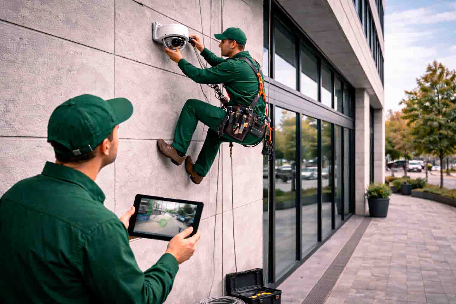 Установка камер на фасадах, кровлях и опорах с привлечением промышленных альпинистов. Актуально для складов, заводов и многоэтажных домов.